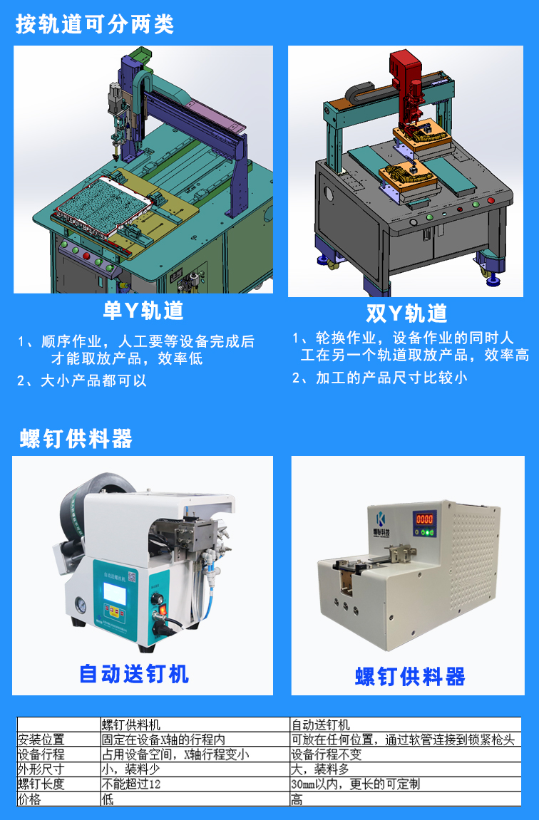 桌面型自動鎖螺絲機,主打是小規模半自動生產線。具有小型輕巧,可雙Y軸同步交替作業,提升生產效率;螺絲通用性好,通過更換螺絲送釘機或螺絲盒可實現通用M1.0~M4的螺絲,適合